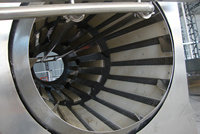 由電機帶動中間軸上的鏈輪旋轉(zhuǎn)從而帶動滾筒的旋轉(zhuǎn),滾筒上有三個大法蘭,由六個托輪支撐,滾筒速度可由電機作調(diào)整。滾筒內(nèi)壁裝有導料長條,滾筒內(nèi)有噴淋水管,下方有兩個水箱,進料方噴淋管的水來自出料邊水箱,此水采用循環(huán)水;出料處的噴淋水來自進料邊的水箱,此水是清水。